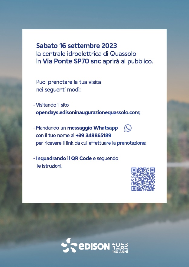 Sabato 16 settembre 2023 la centrale idroelettrica di Quassolo in Via Ponte SP70 snc aprirà al pubblico.