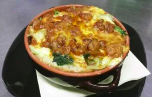 Al termine versare del buon brodo, in modo da inzuppare accuratamente il pane, versare sulla zuppa un pò di burro fuso, che abbia raggiunto il colore ambrato, e sistemare la teglia nel forno.
