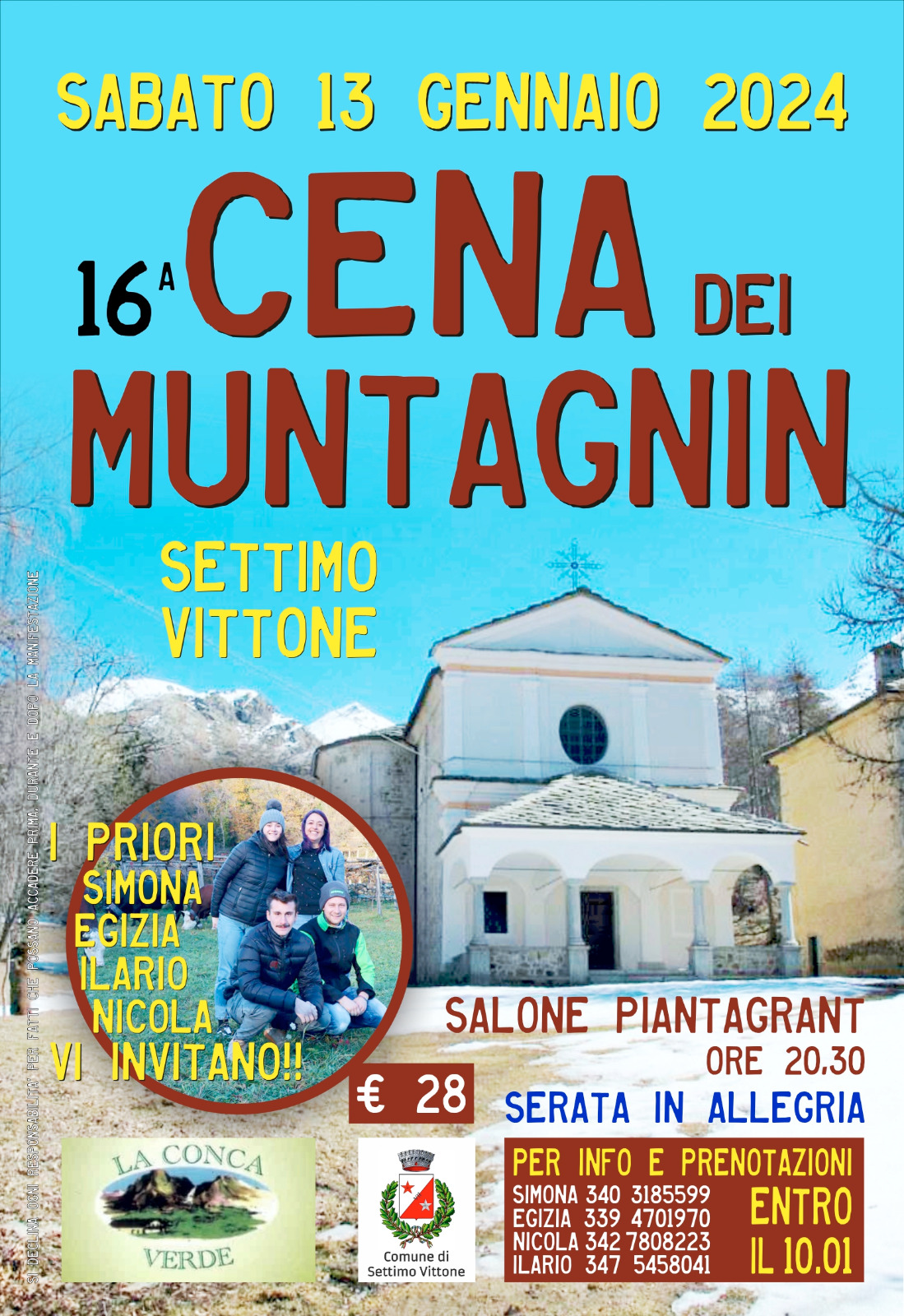 I priori Simona, Egizia, Ilario e Nicola Vi Invitano alle Cena dei Muntagnin Presso il Salone Piantagrant Sabato 13 Gennaio 2024 alle ore 20.30