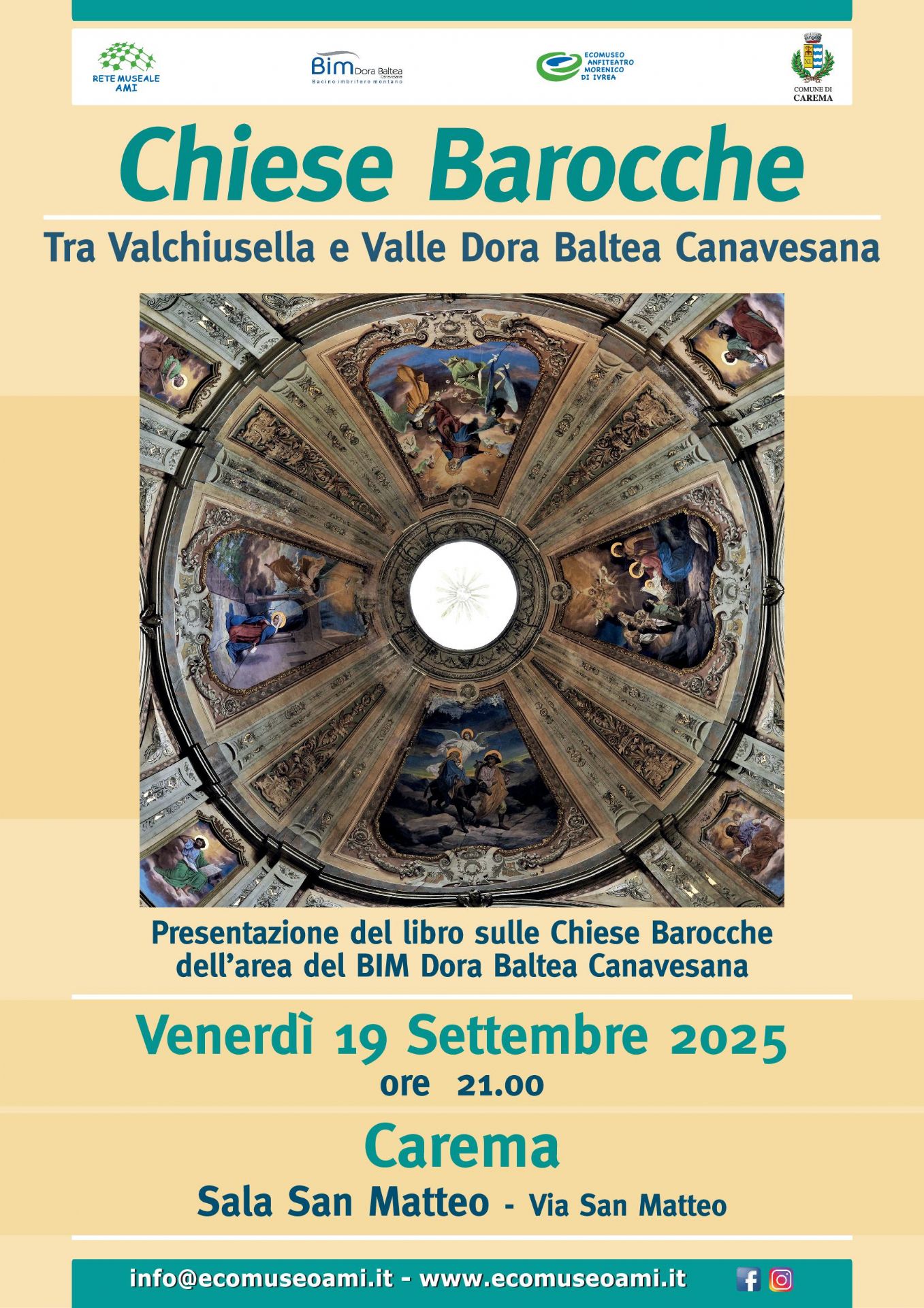 Venerdì 19 settembre 2025 alle ore 21:00 presso la Sala San Matteo in via San Matteo avrà luogo la presentazione del libro sulle Chiese Barocche dell'area del BIM Dora Baltea Canavesana.