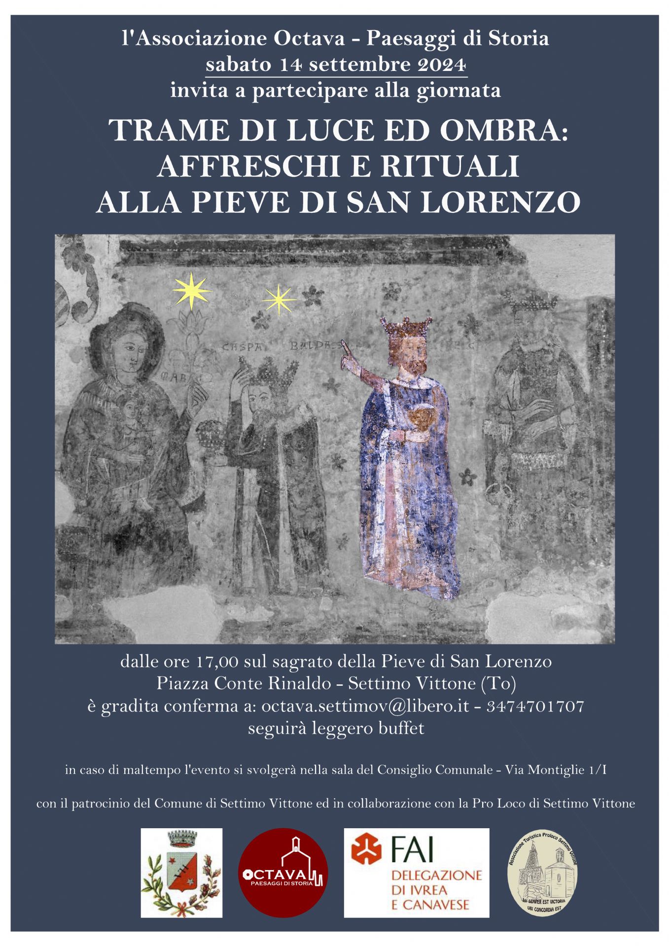 L'associazione Octava - Paesaggi di storia invita a partecipare alla giornata che si svolgerà Sabato 14 Settembre dalle ore 17:00 presso la Pieve di San Lorenzo, Piazza Conte Rinaldo - Settimo Vittone (TO).