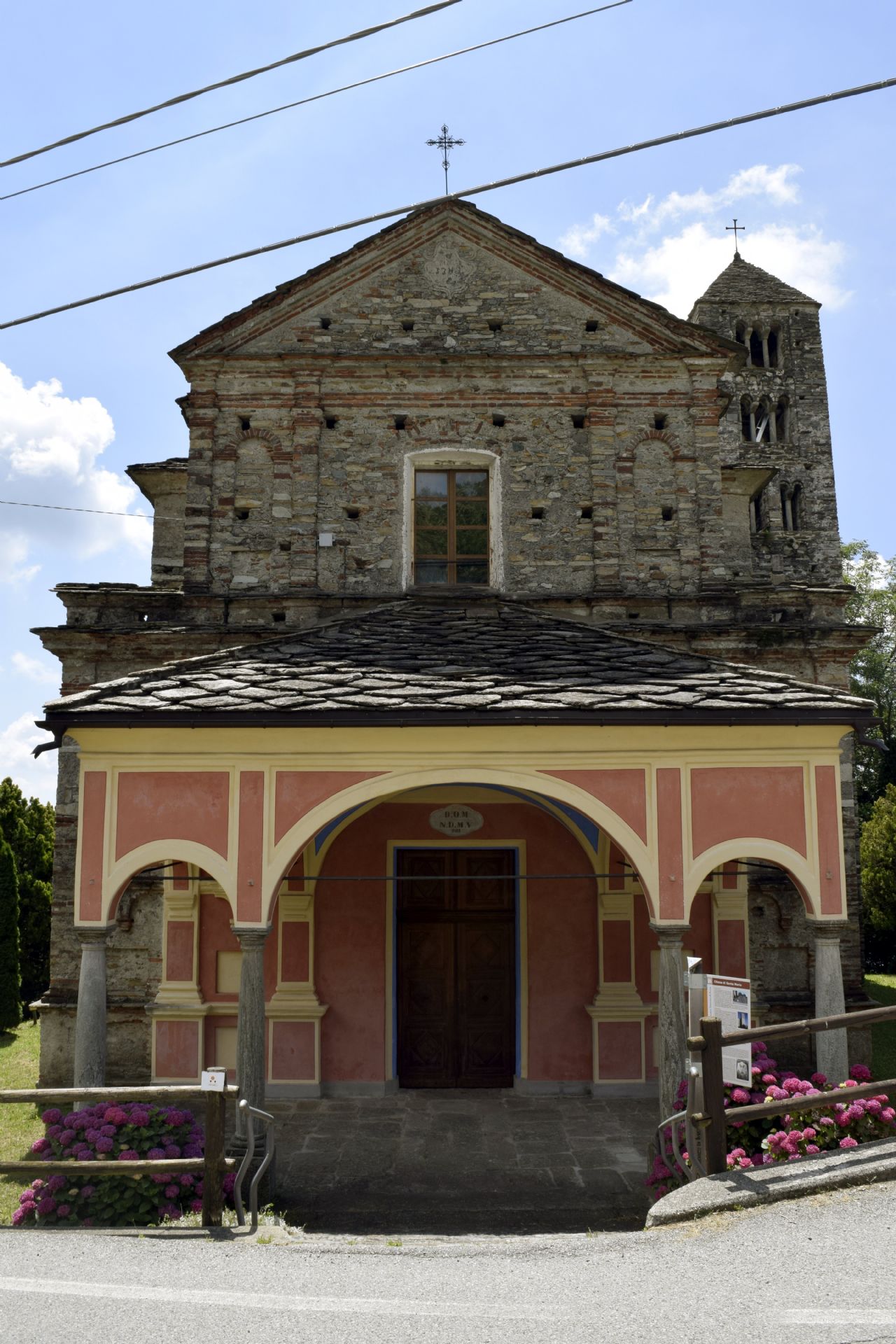 L'edificio attuale è frutto di radicali trasformazioni realizzate nel '700 e nell''800; dell'impianto romanico resta solo una porzione di muro all'interno, che presenta un frammento di affresco quattrocentesco raffigurante la Vergine e Santa Caterina. Integro nelle sue forme romaniche è invece lo splendido campanile in pietra locale, le cui origini si possono collocare alla fine dell' XI sec. Il corpo è suddiviso in sei piani, con una regolare successione partendo dal basso di feritoie, monofore, bifore e due ordini di trifore a tutto campo, racchiuse in campiture coronate da archetti pensili. I capitelli delle bifore e delle trifore sono sorretti da colonnine in pietra, alcune delle quali decorate alle estremità con semplici incisioni.