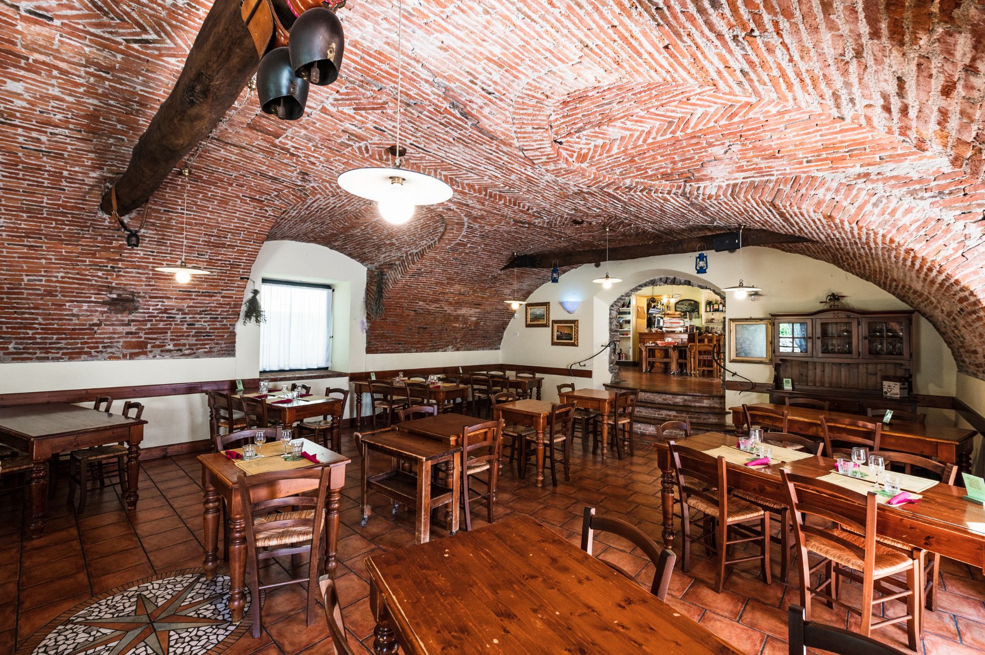 La sala principale con la volta di mattoni a vista può ospitare anche grandi tavolate, mentre una sala più piccola consente di godere di maggiore tranquillità e riservatezza. Durante la bella stagione, l’antica corte interna e il giardino sul lato opposto consentono di mangiare all’aperto, nel verde e nella brezza fresca che spira dalla vicina Valle d’Aosta.