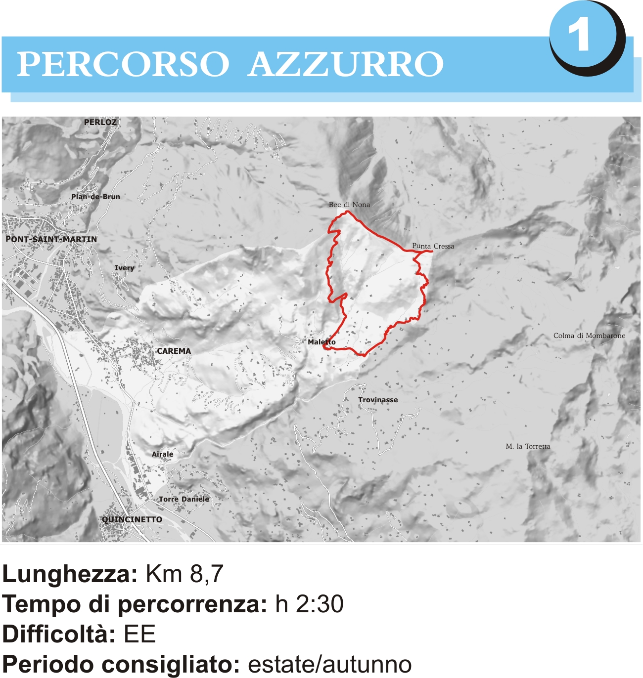 | Modalità di accesso | Il percorso parte e arriva all'Alpe Maletto a 1325 m; la quota più alta è posta a 2085 m sul Bec di Nona. L'itinerario percorre un sentiero di montagna, pertanto non è accessibile alle persone con ridotta o impedita capacità motoria. |